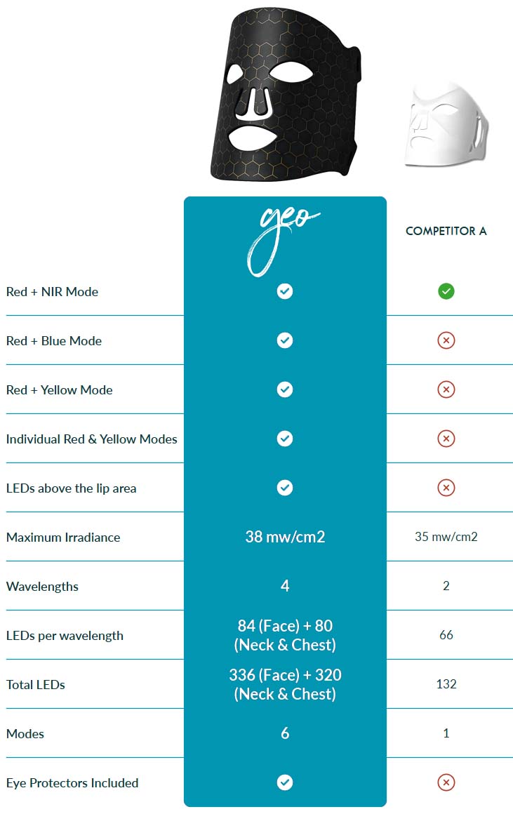 • Nära infrarött ljus (830 nm) tränger djupare än andra våglängder och arbetar på cellnivå för att öka hudens energi och minska inflammation.